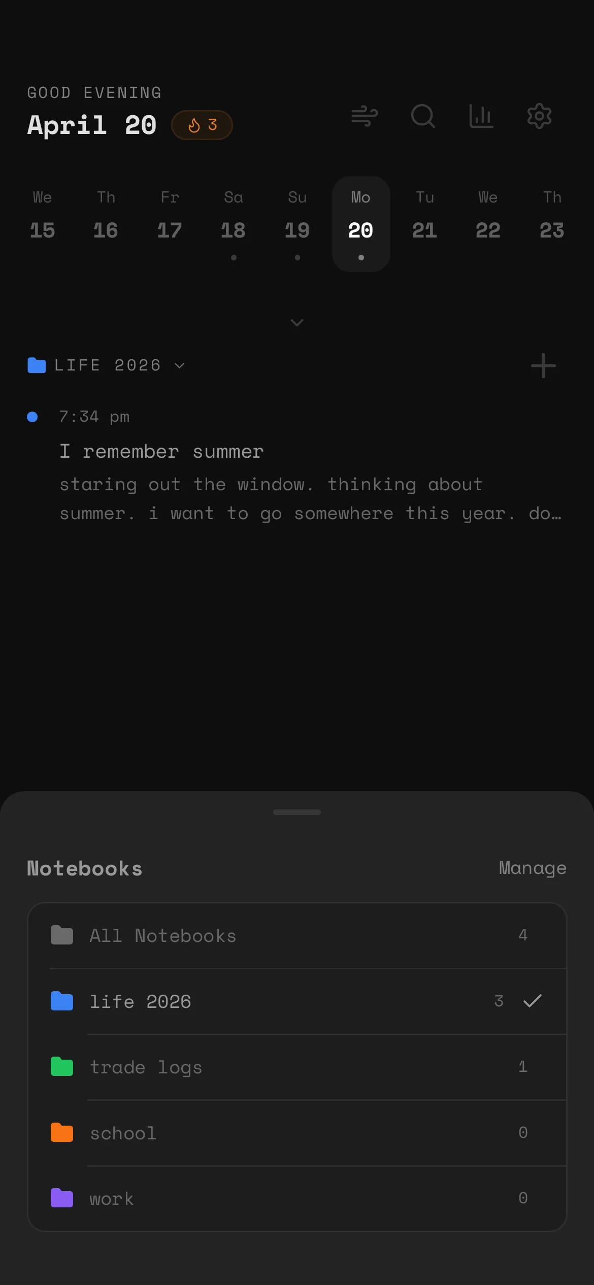 A private journal that lives on your device. Write freely. No accounts, no cloud, no one watching.